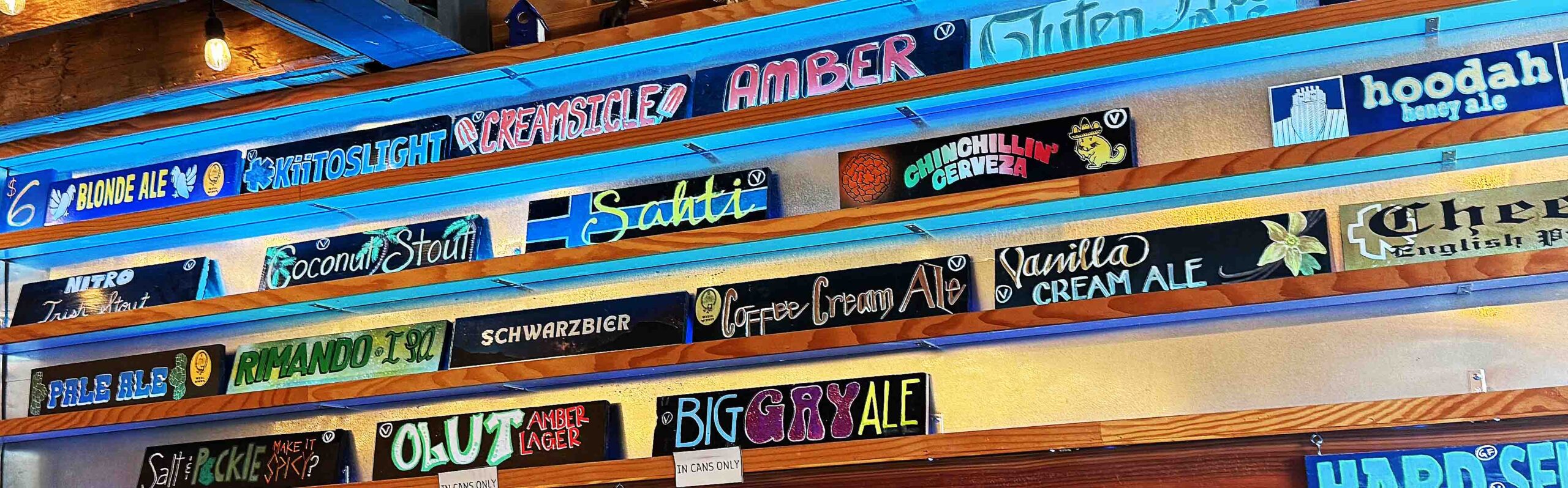 More over, all drafts must be 5% alcohol by volume (ABV) or less – such that in many breweries the ABV isn’t even shown on the beer lists. This means that IPA’s and other typically stronger beers are restricted down to 5%, and typically lower alcohol beer styles like Mexican Lagers and Kolsch’s are often “amped up” to 5% as well. But lovers of the more potent brews are usually OK – as the breweries can sell their canned beer of any strength at the bar, and the ABV content of these so called “High Point” beers is very noticeably advertised. (In grocery stores beer displays include signs that say “Notice Alcohol Content”. ) In most cases the 5% usual drafts and the high point cans are listed on separate signs in the breweries themselves.